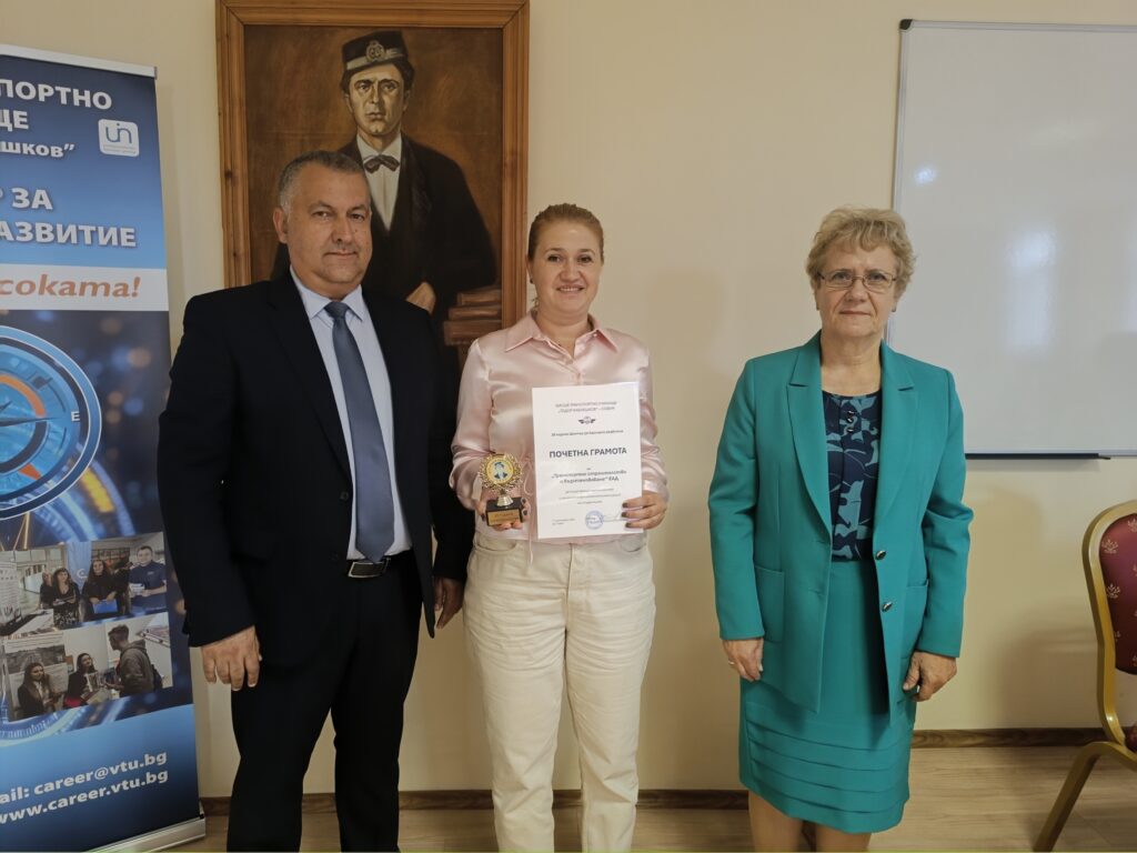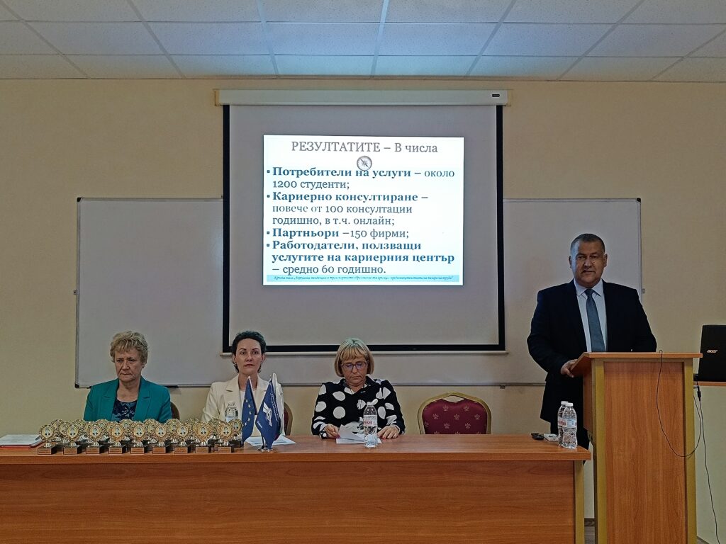 Ръководителят на Кариерния център доц. д-р Нина Димитрова запозна гостите с историята на центъра, след което получи от ректора почетна грамота и статуетка в знак на благодарност за усилията и неуморния труд и ентусиазъм за създаването и развитието на Кариерния център, за дългогодишното успешно ръководство и за всеотдайната й работа със студентите и работодателите.