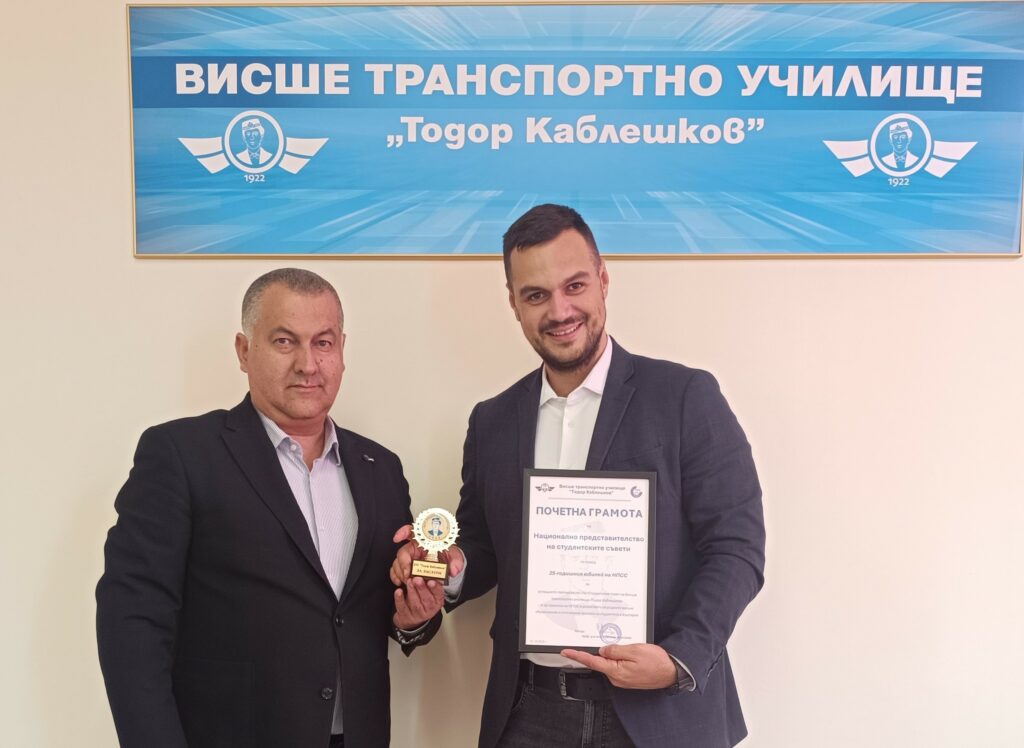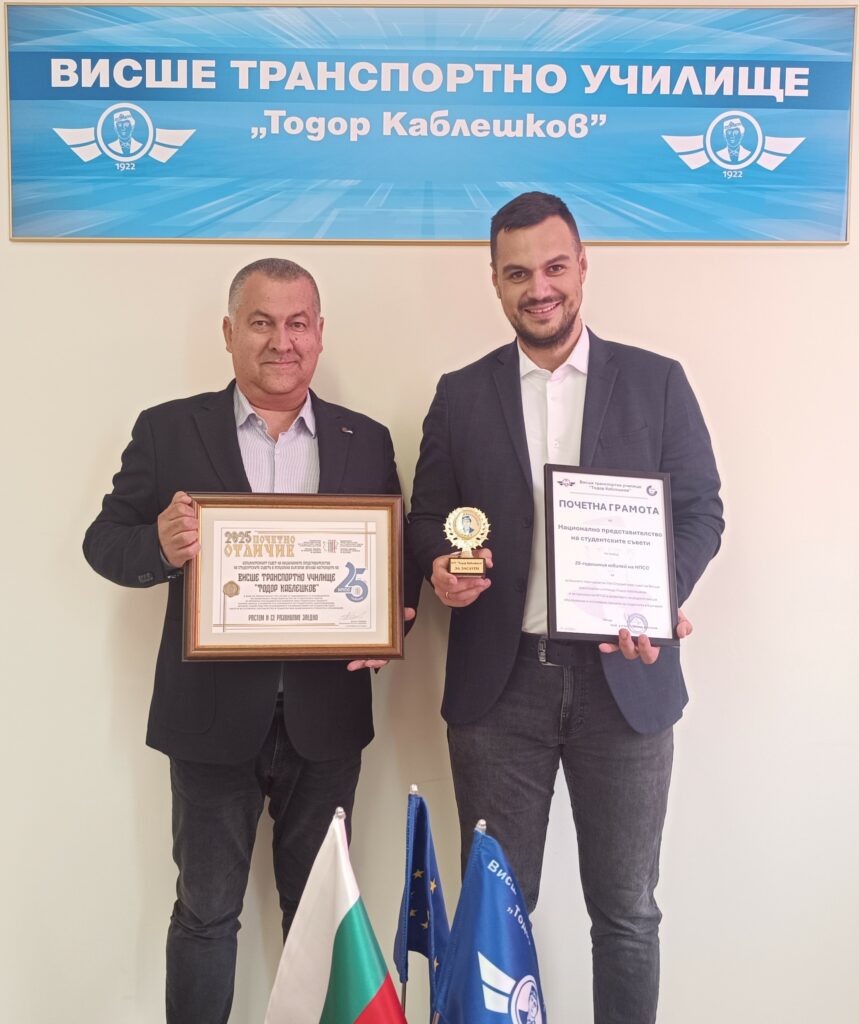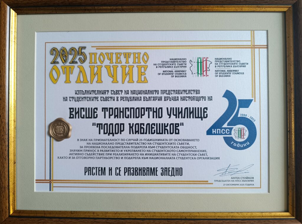 На 17 ноември 2025 г. ректорското ръководство на Висше транспортно училище „Тодор Каблешков“ проведе среща с г-н Ангел Стойков, председател на Националното представителство на студентските съвети (НПСС). Ректорът проф. д-р инж. Красимир Кръстанов получи почетно отличие по случай 25 години от създаването на НПСС и от своя страна връчи на г-н Стойков грамота от името на нашата академична общност в знак на благодарност за успешното партньорство със студентския съвет на ВТУ и за приноса на националната студентска организация в развитието на родното висше образование и отстояване правата на студентите в България.