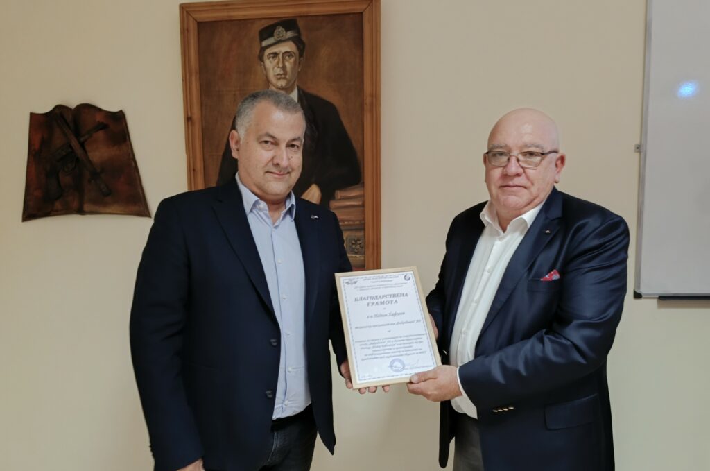 Трогателен момент бе и изказването на г-н Иван Омайски, който, в качестото си на председател на клуба на офицерите и сержантите от запаса и резерва на войските на Министерството на транспорта и ВТУ, представи накратко събития от курсантските години и последвалия професионален път на г-н Хафузов и тържествено му връчи почетна членска карта за клуба.
