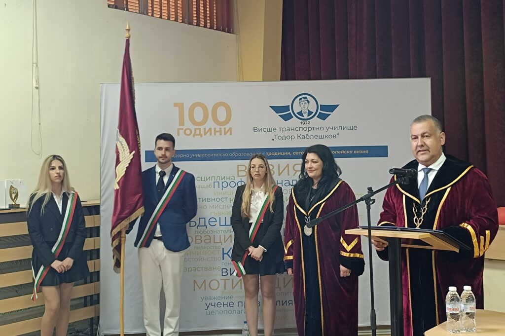 The event traditionally started with the welcoming of our flag, after which the graduates were congratulated by the Rector Prof. Dr. Eng. Krasimir Krystanov, Mrs. Mariana Ivanova, Deputy Mayor of Slatina Municipality, Eng. Martin Angelov – Executive Director of ,,Holding BDZ” EAD, Mrs. Raya Guncheva – Public Relations Director of ,,Huawei Technologies Bulgaria”, Eng. Kiril Paskov – Deputy Director of ,,Stolichen Autotransport” EAD, Eng. Mr. Ivan Omayski.