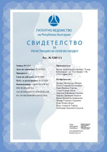 Certificate with registration No. 4975 U1 (16.12.2024), issued by the Patent Office of the Republic of Bulgaria, for registration of a utility patent.