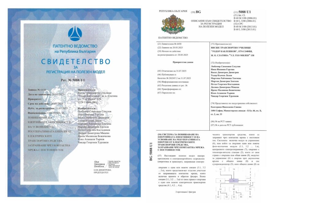 At the end of 2024. The Higher School of Transport “Todor Kableshkov” officially received a certificate with reg. No. 4975 U1, issued by the Patent Office of the Republic of Bulgaria, for the registration of a utility patent with the name of the patent “TESTER FOR PHOTOVOLTAIC MODULES”. The inventors are the lecturers from the Department of “Power Supply and Electrical Equipment of Transport” Assoc. Prof. Lyubomir Sekulov, Assoc. Prof. Martina Tomcheva, Senior Asst. Todor Lalev, Senior Asst. Martin Zlatkov, Senior Asst. Petko Kostadinov, Asst. Dilyana Mitseva, Asst. Irena Bozhichkova and PhD students Emil Dodov and Dimitar Konov.