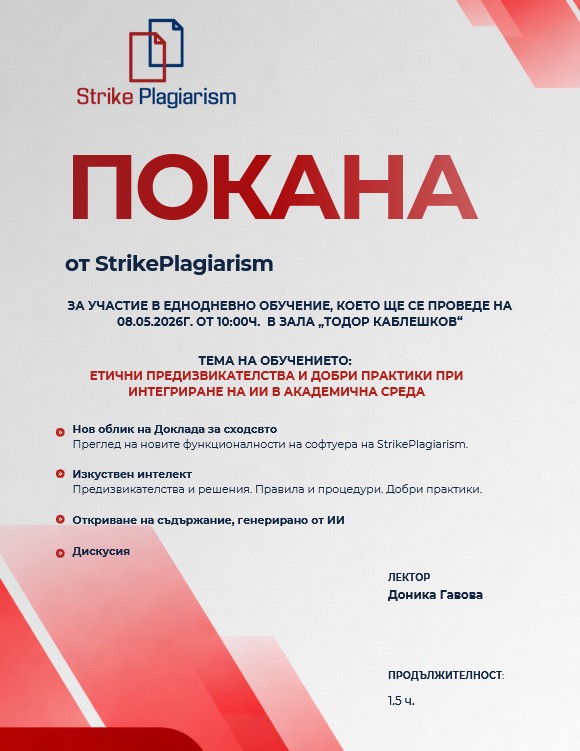 На 8 май 2026 г. (петък) от 10:00 часа в зала „Тодор Каблешков“ ще се проведе обучение с нашите партньори от StrikePlagiarism на тема: „ЕТИЧНИ ПРЕДИЗВИКАТЕЛСТВА И ДОБРИ ПРАКТИКИ ПРИ ИНТЕГРИРАНЕ НА ИИ В АКАДЕМИЧНА СРЕДА“.