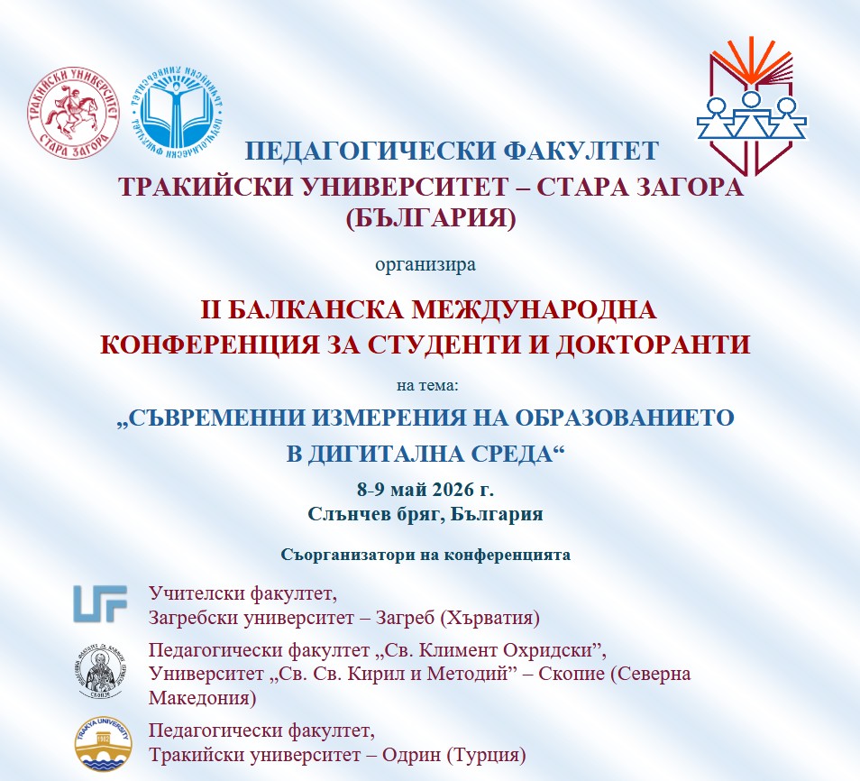 Педагогическият факултет на Тракийски университет – Стара Загора организира организира II БАЛКАНСКА МЕЖДУНАРОДНА КОНФЕРЕНЦИЯ ЗА СТУДЕНТИ И ДОКТОРАНТИ на тема: „Съвременни измерения на образованието в дигитална среда“.